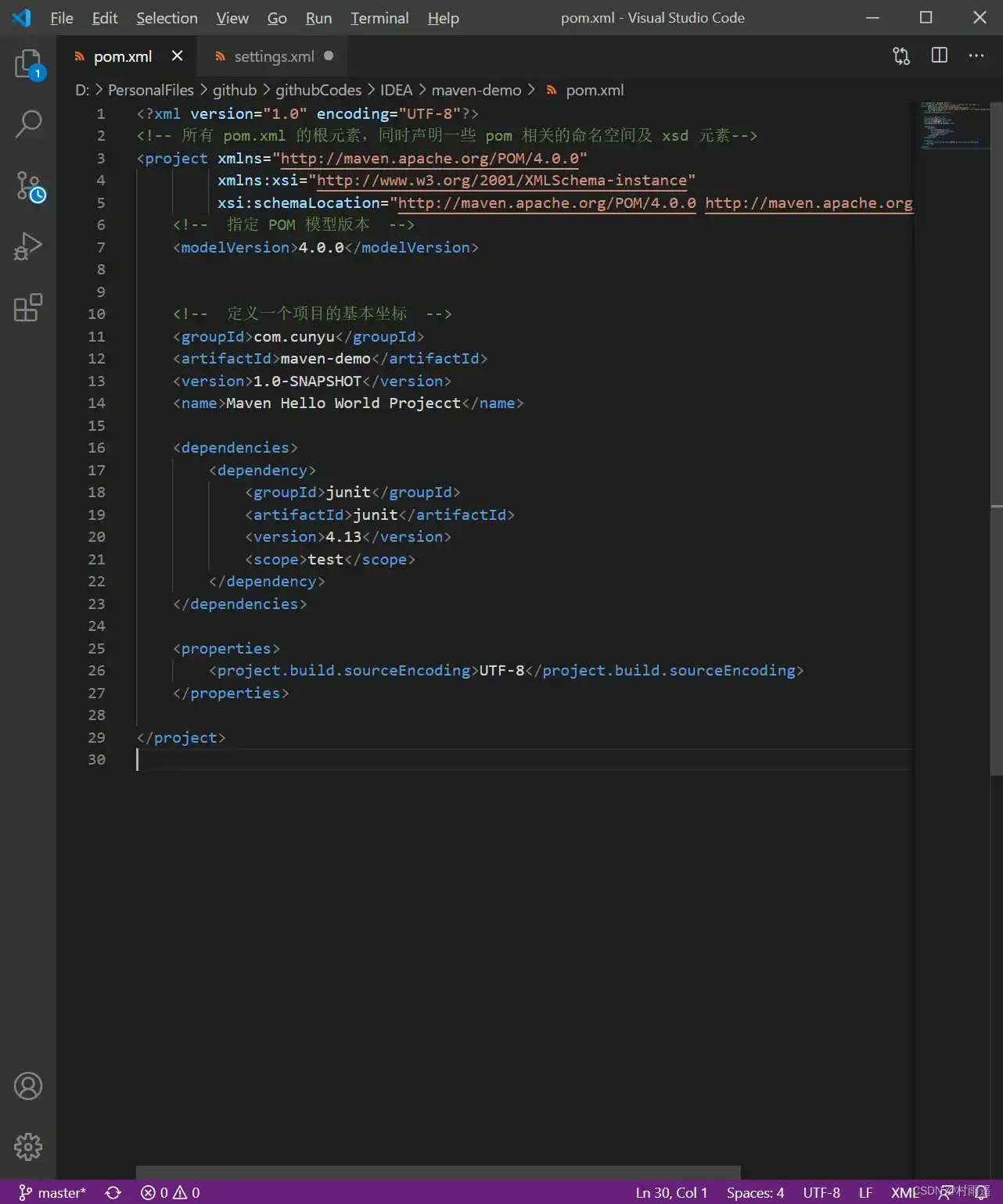最后则是 pom.xml,这个每个 Maven 所管理项目的核心文件,这是必须的,后续的依赖管理等工作都基于此文件来操作。