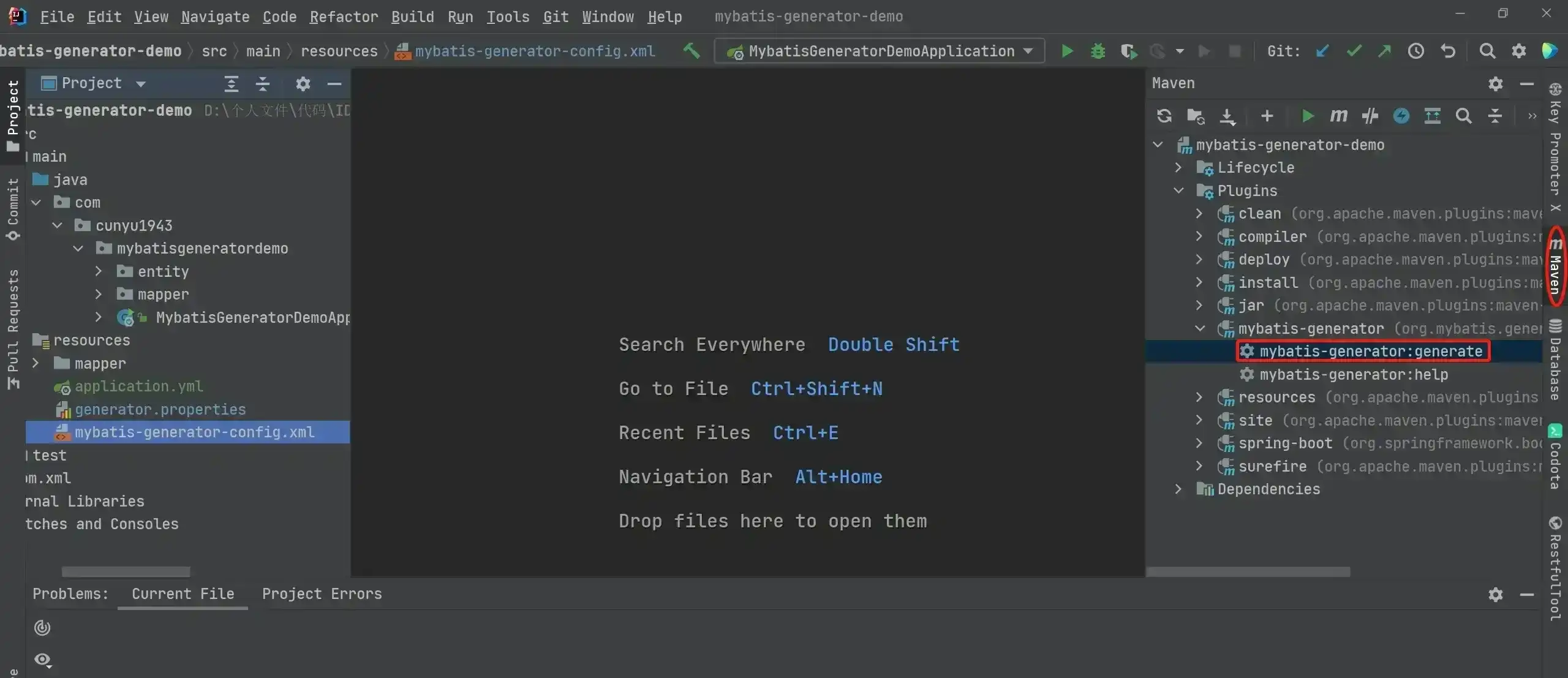 jdbc.driver-class-name=com.mysql.cj.jdbc.Driver最后,当完成所有配置后,就可以利用 Maven 工具来进行代码生成了。具体操作方法如下,点击项目 Maven 配置中的 MyBatis Generator 生成即可。