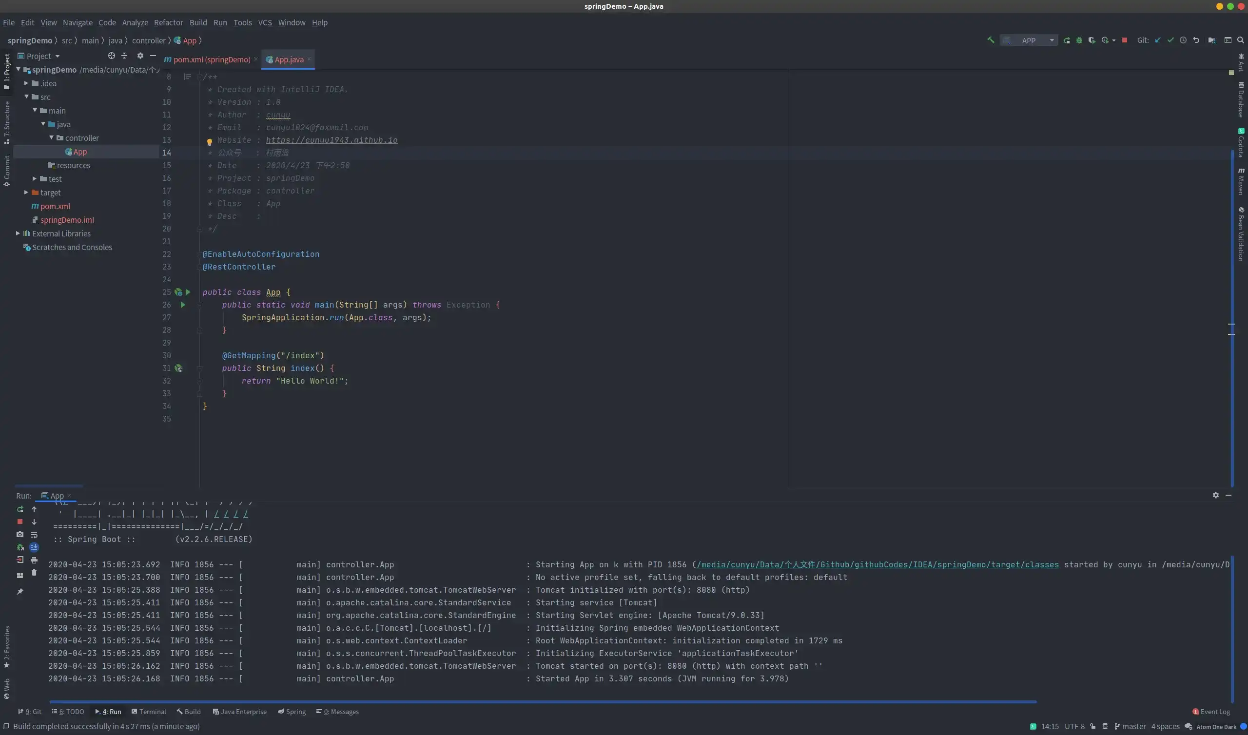 项目具体依赖,默认包含 spring-boot-starter-web,用于实现HTTP接口(该依赖中包含了Spring MVC);spring-boot-starter-test用于编写单元测试的依赖包。后续开发中,主要就是在这里添加各种依赖。