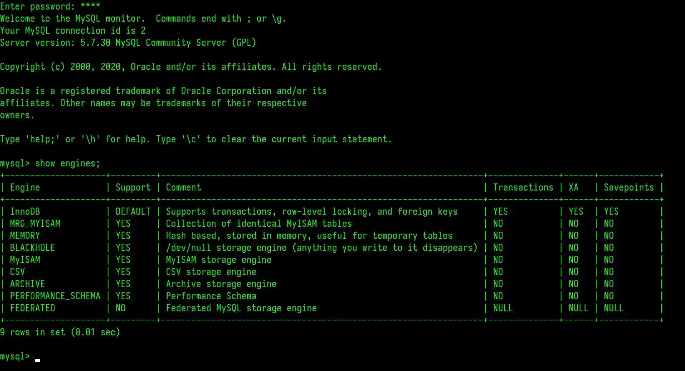 要查看 MySQL 中所提供的引擎,可以通过如下命令: