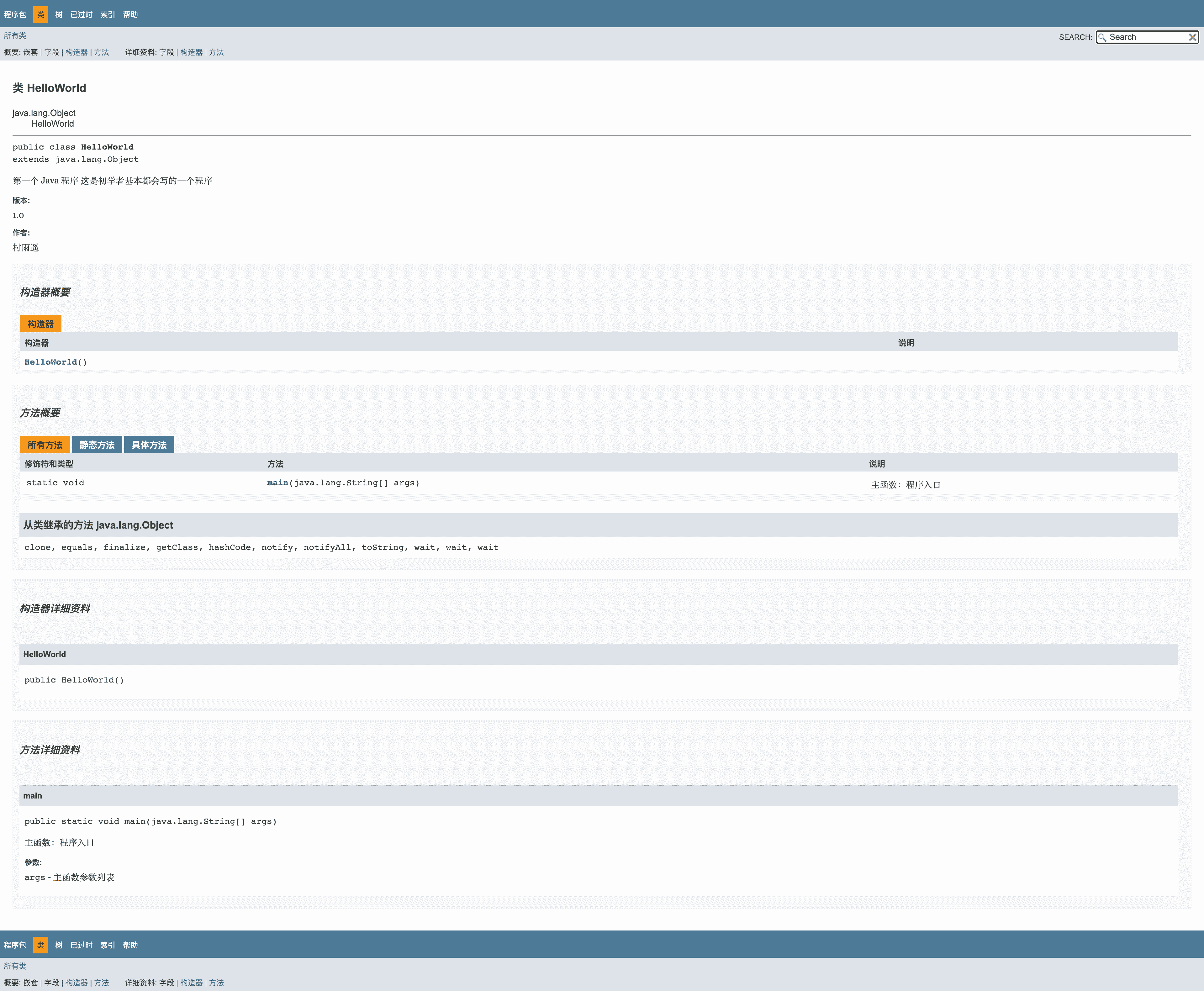 javadoc -d helloworld -author -version -encoding UTF-8 HelloWorld.java以上命令的意思就是,对名为 HelloWorld.java 的提取其中的文档注释,并将输出的文件放在 helloworld 文件夹下,并且在文档中包含程序作者和版本,编码方式为 UTF-8。