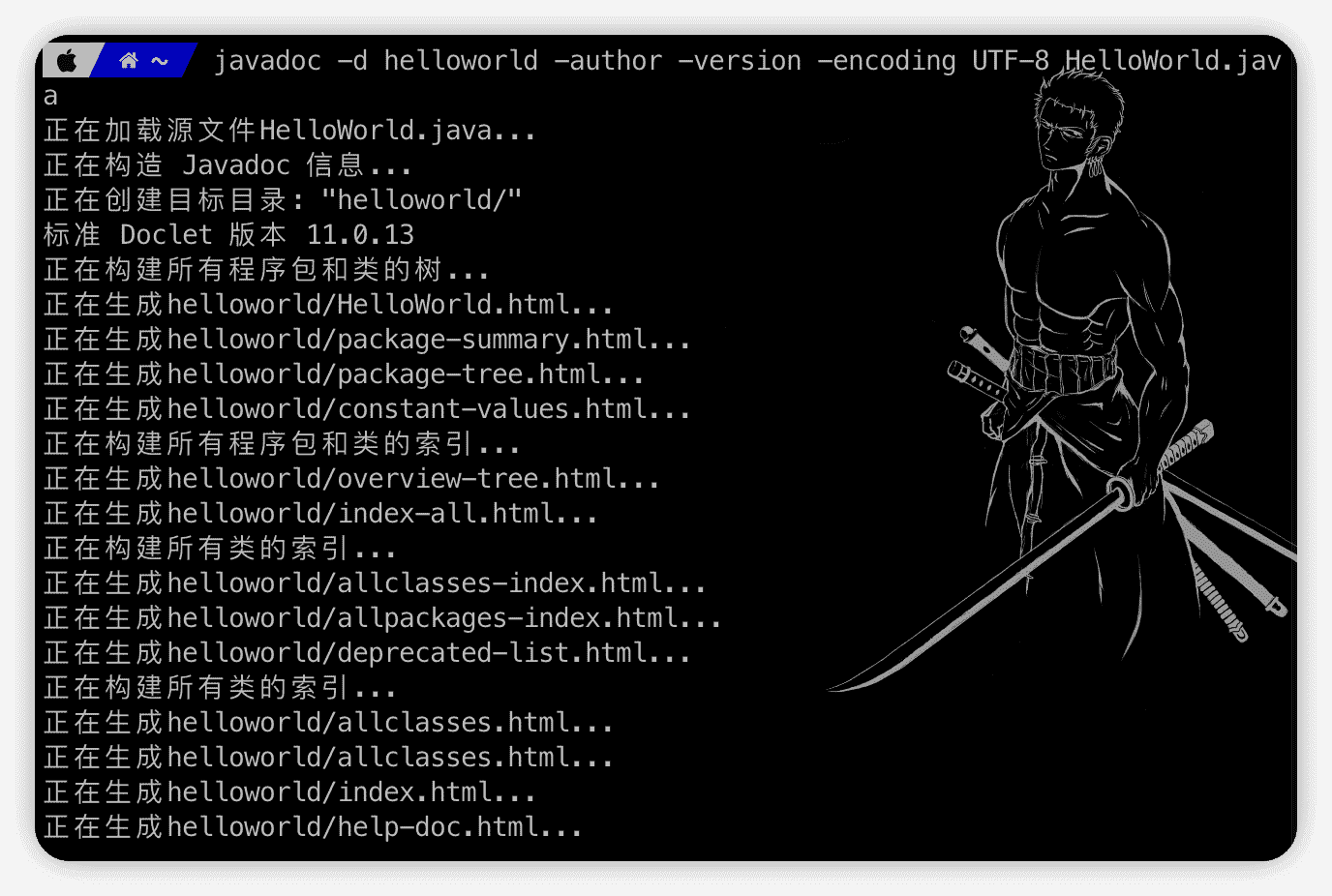 }然后我们通过终端,使用 javadoc 命令就可以为上述文件生成一个 HTML 文档。