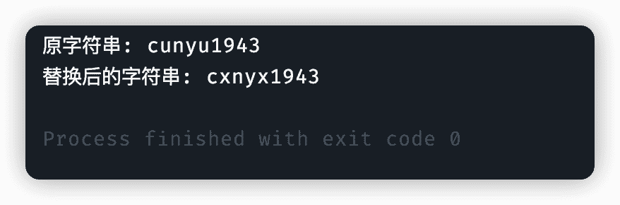 System.out.println("替换后的字符串: " + str.replace(ch1, ch2));