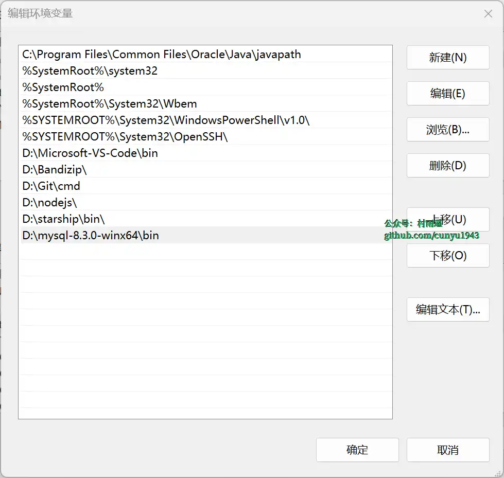 第二步,添加环境变量,在系统变量的 Path 下新增指向 MySQLbin 目录。