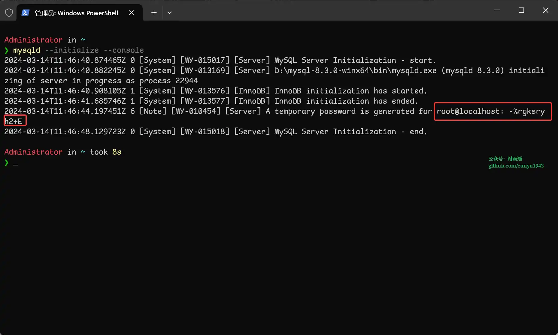 第四步,以管理员权限打开控制台,输入以下命令,会打印初始化的 root 密码,一定要记住,待会儿要用它来改密码。