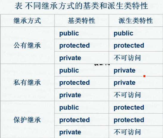 - 保护继承 protected:父类的公有成员和保护成员成为子类的保护成员,且只能被他的派生类成员函数或友元访问,父类私有成员仍为私有;