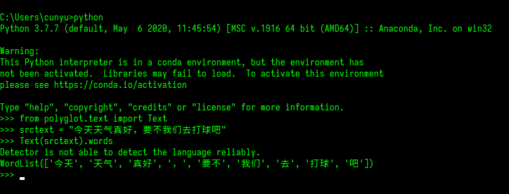 最后,既然安装成功了,那就得试一下呀!以下是一个利用 polyglot 分词的结果,可以看看效果如何哦。 另外,你觉得相比于 jieba、SnowNLP、PkuSeg、THULAC、HanLP 等分词工具,谁的效果更胜一筹呢?