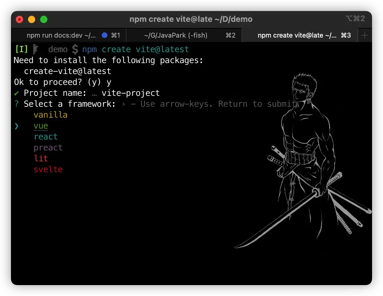 npm create vite@latest然后根据提示进行相关设置即可,这里需要注意的是它会让我们选择框架,这就需要根据我们的需求来进行选择了。
