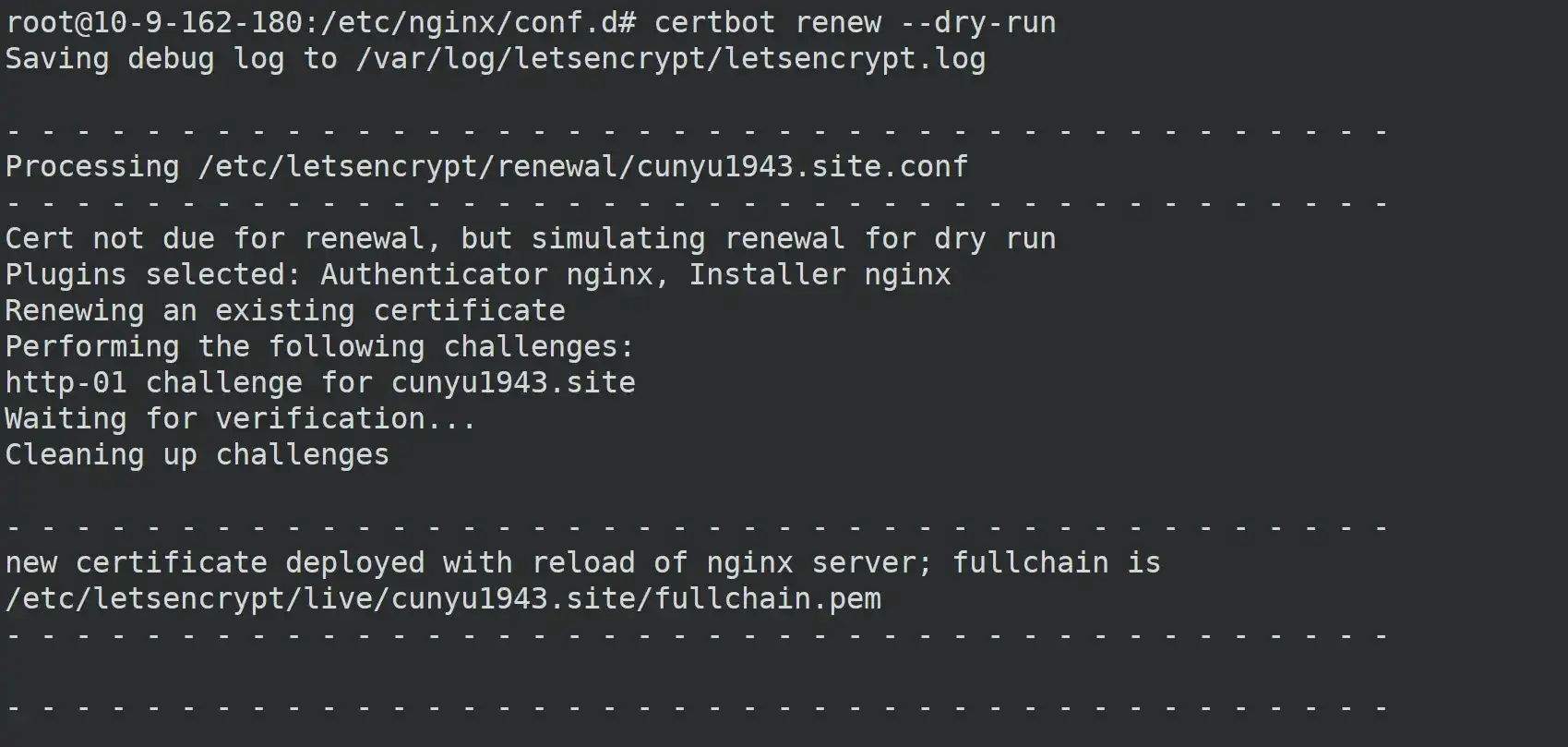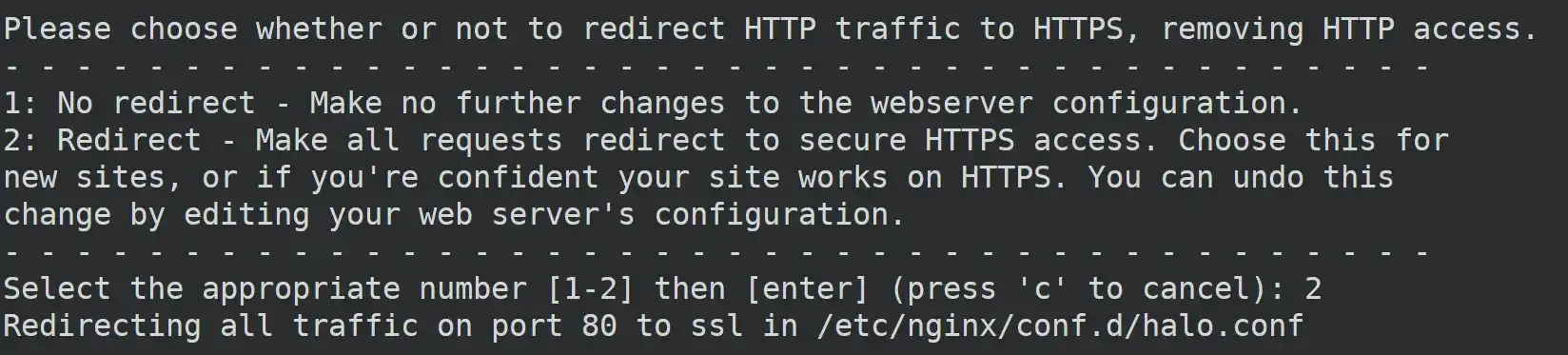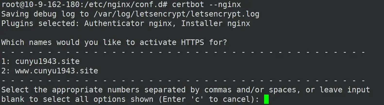 sudo apt-get install python-certbot-nginx接着执行配置,过程中会询问为哪个域名添加证书,以及是否重定向,如实选择即可;