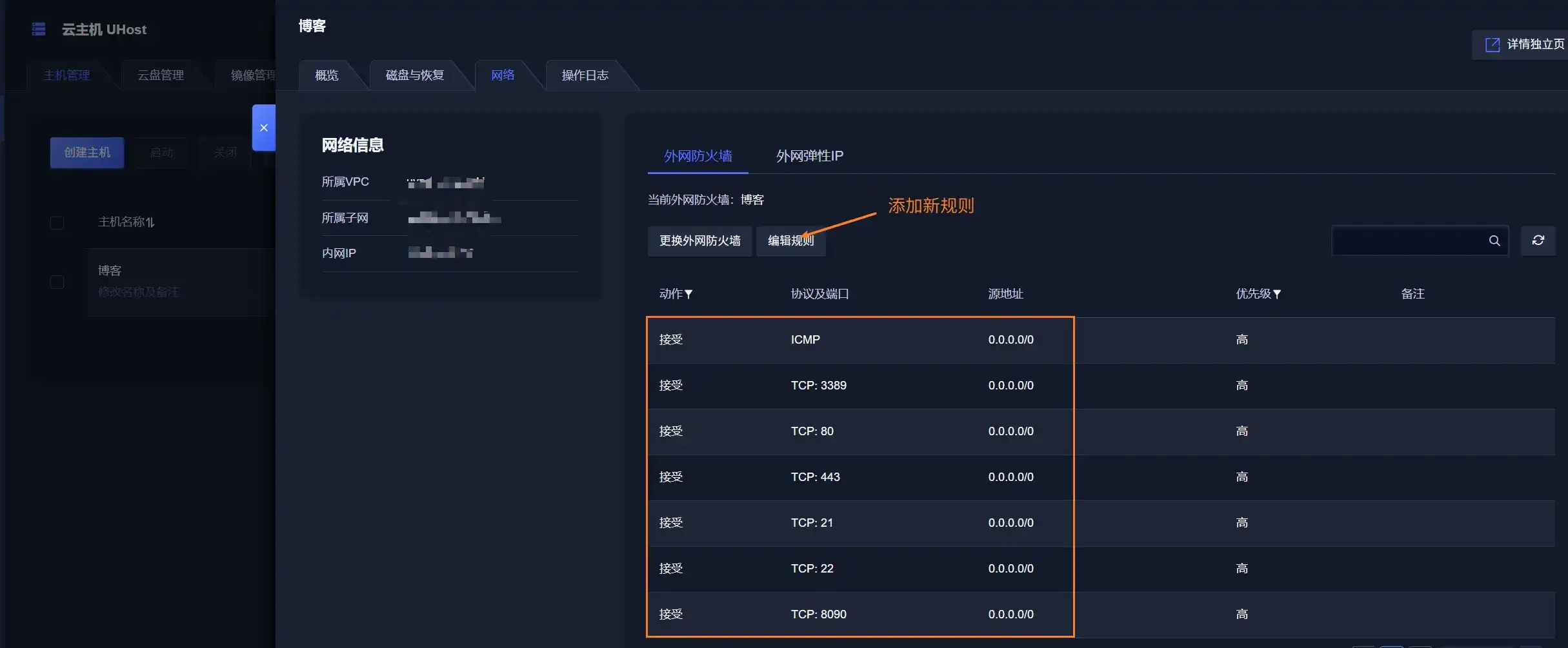 - 接着编辑防火墙,将需要打开的端口打开即可,一般打开如下的协议端口就可以了;