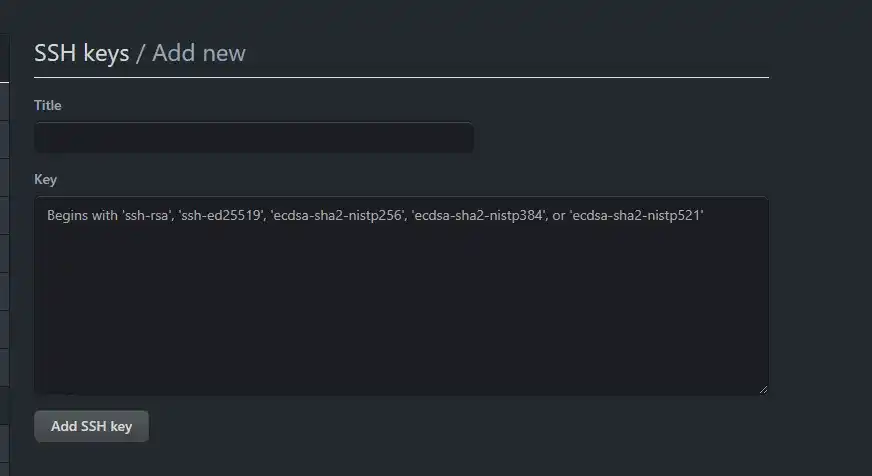 然后打开 GitHub-Settings-Keys 页面,创建一个新的 SSH key,填写 Title 和 Key,Title 可以随意,而 Key 的内容则是我们刚才复制的 id_rsa.pub 中的内容,最后点击 Add SSH key 即可;