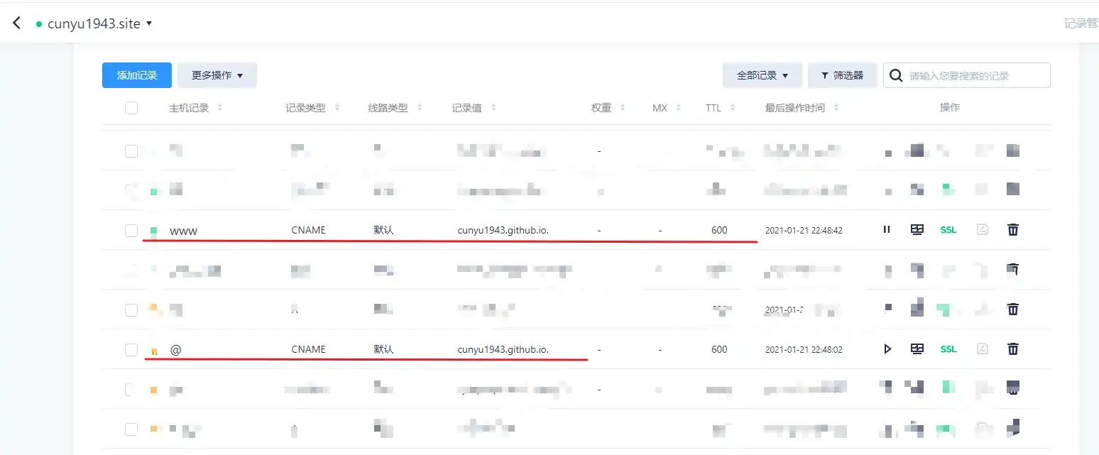 通过 用户名.github.io 的方式来访问总归是有些不方便,如果我们需要自己的个性域名,又应该如何设置呢?那么在此之前,你需要有一个已经备案好的域名,如果没有的话,请到阿里云、腾讯云等场商购买自己的域名,然后通过该平台备案,然后添加两条解析记录,以我的腾讯云为例: