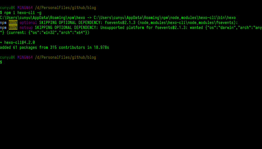 在你的硬盘上找个地儿,用来存放你的博客文件,比如我的就在 D:personalFiles/github/blog,这个文件夹你可以根据自己的喜好来设置。然后从命令台进入当前文件夹,接下来就是安装过程了;