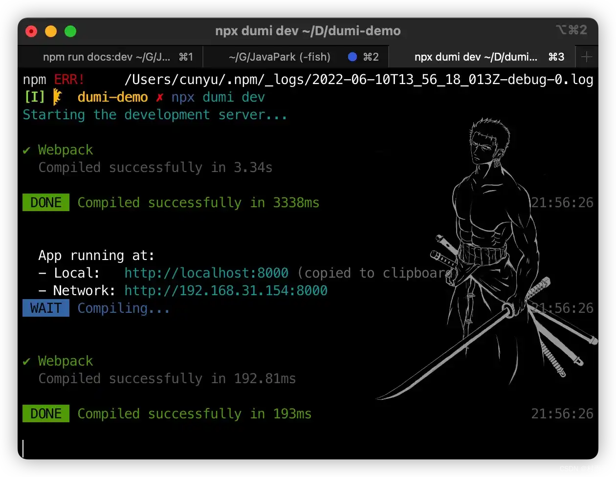 dumi 支持两种初始化脚手架的方式,一种是组件开发脚手架,另一种则是静态站点脚手架,这里主要介绍如何使用组件开发脚手架。