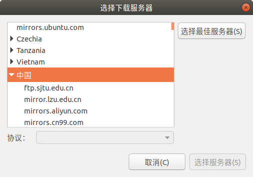 打开 软件和更新 ,然后选择下载自 其他站点,选择你要设置的镜像源站点即可,也可以点击右侧选择最佳服务器,会根据你所处地区然后自动选择网速最快的;
