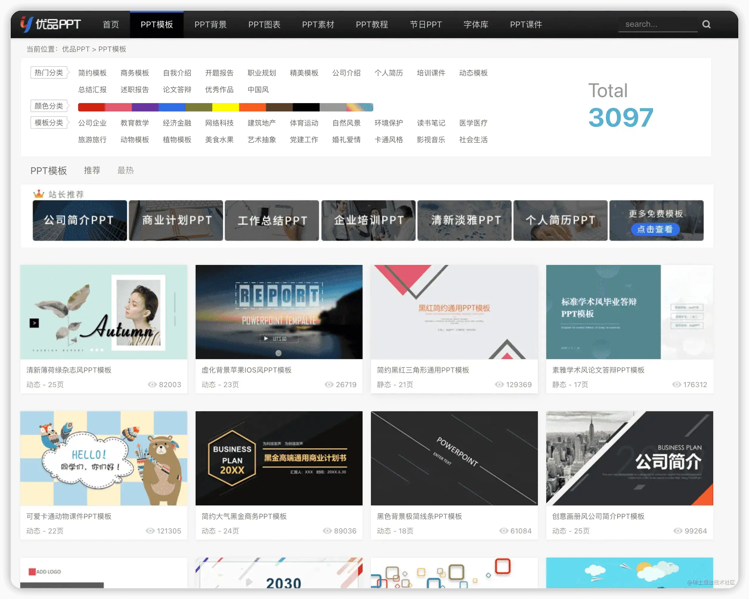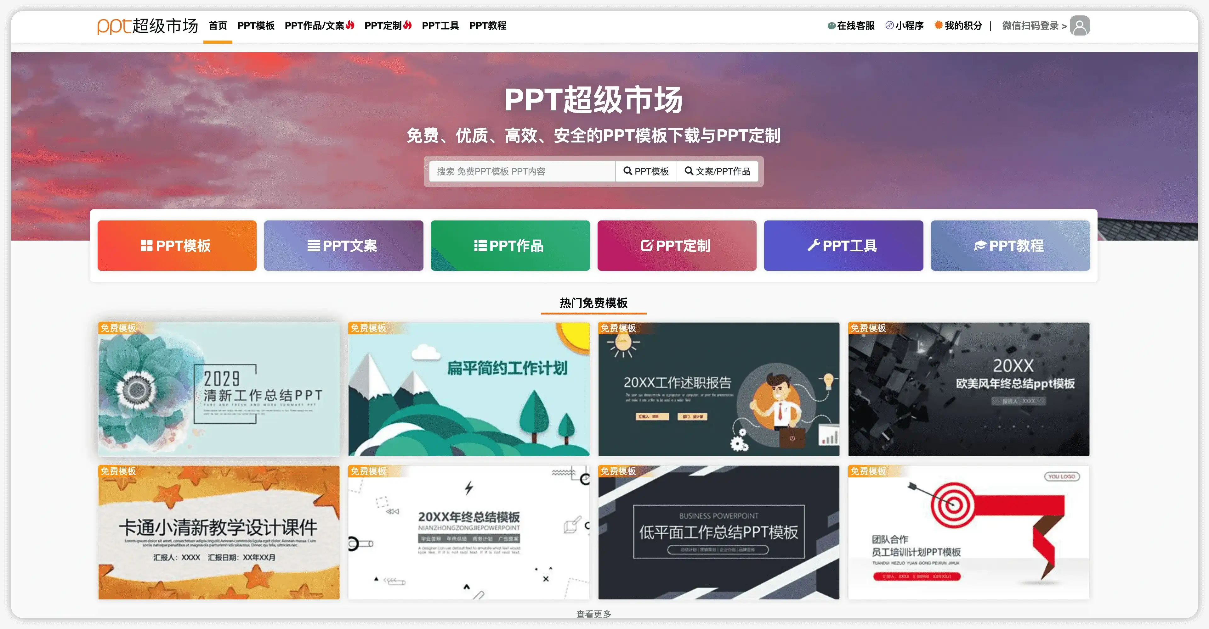 听名字就知道,这里是就像超市一样,提供各式各样的 PPT 作品和相关服务。这里不仅提供免费、优质、高效、安全的 PPT 模板下载,还提供 PPT 定制化增值服务,无论是想白嫖还是花钱买省心,都可以来这里来试试。网站主要分为 PPT 模板、PPT 作品/文案、PPT 定制、PPT 工具、PPT 教程等模块。
