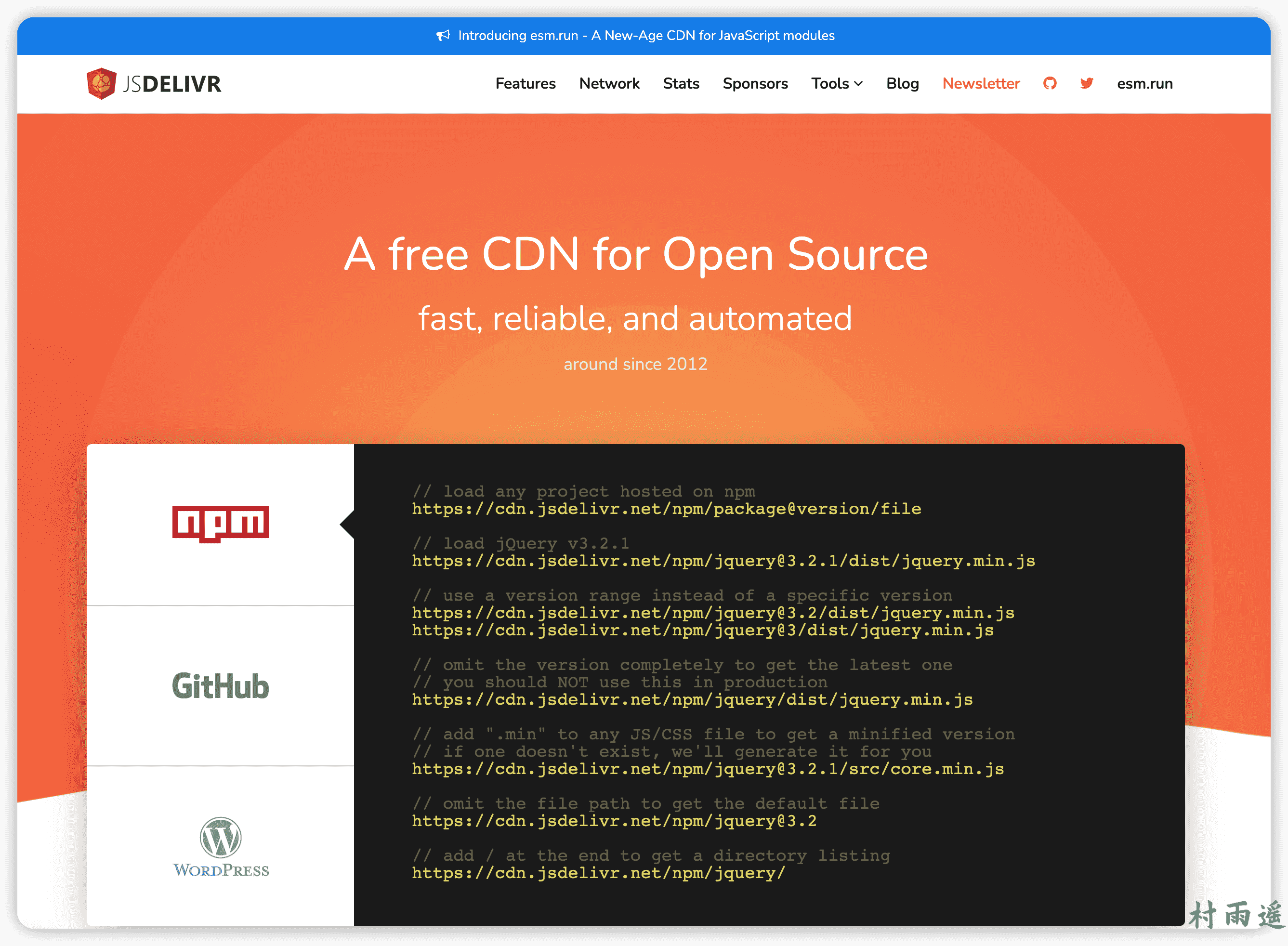 jsDelivr 是一个免费开源的 CDN 解决方案,用于帮助开发者和站长。包含 JavaScript 库、jQuery 插件、CSS 框架、字体等等 Web 上常用的静态资源。想必这个 CDN 大家都不会陌生吧,没准儿在看博客的各位就一直在用着它。