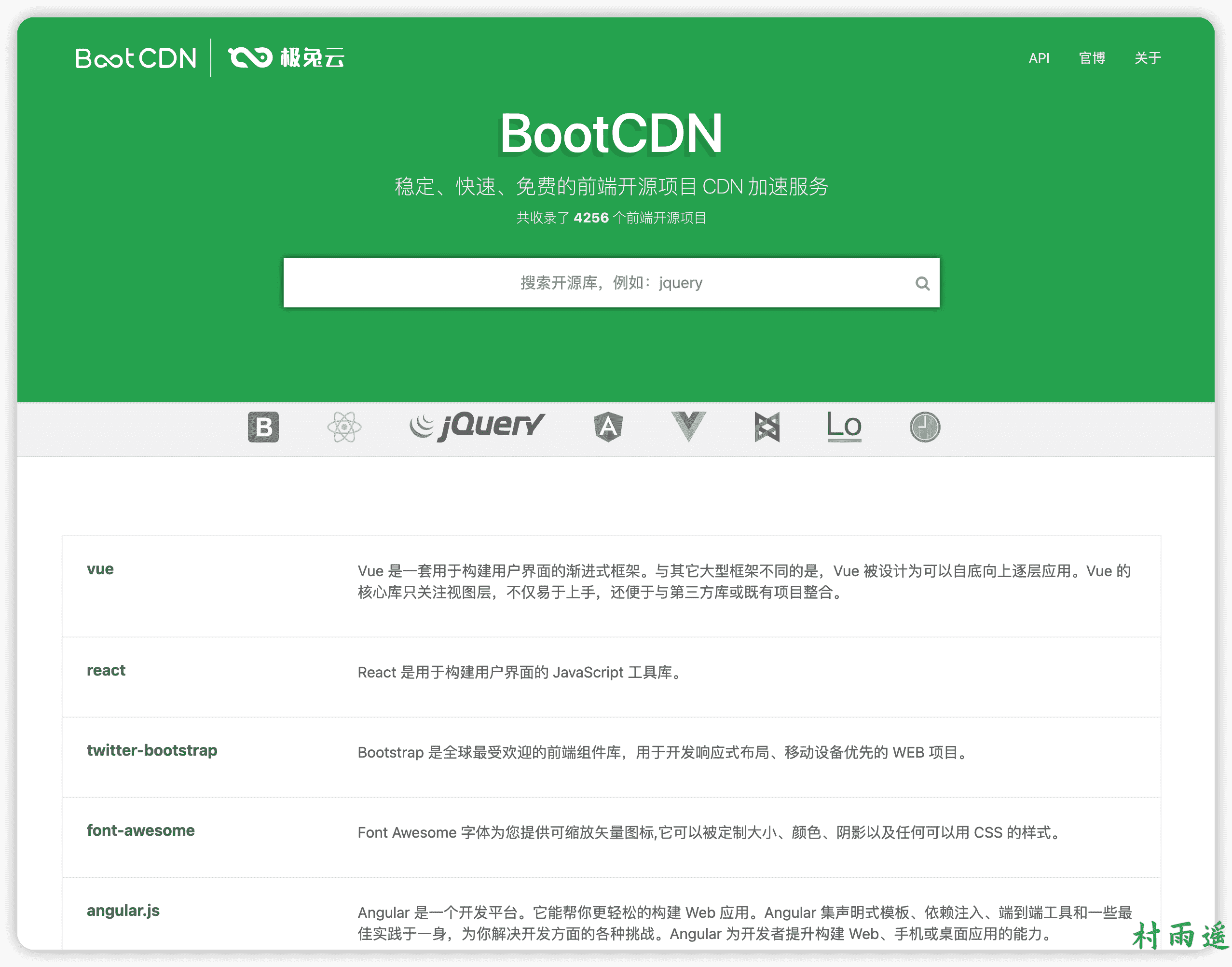 BootCDN 是极兔云联合 Bootstrap 中文网共同支持并维护的前端开源项目免费 CDN 服务,致力于为 Bootstrap、jQuery、React、Vue.js 等优秀的前端开源项目提供稳定、快速的免费 CDN 加速服务。BootCDN 所收录的开源项目主要同步于 cdnjs 开源项目仓库,截止文章写作时共收录了 4256 个前端开源项目。而且自 2013 年以来已经累计为仅百万网站提供稳定可靠的免费 CDN 加速服务,可以说是相当靠谱了!