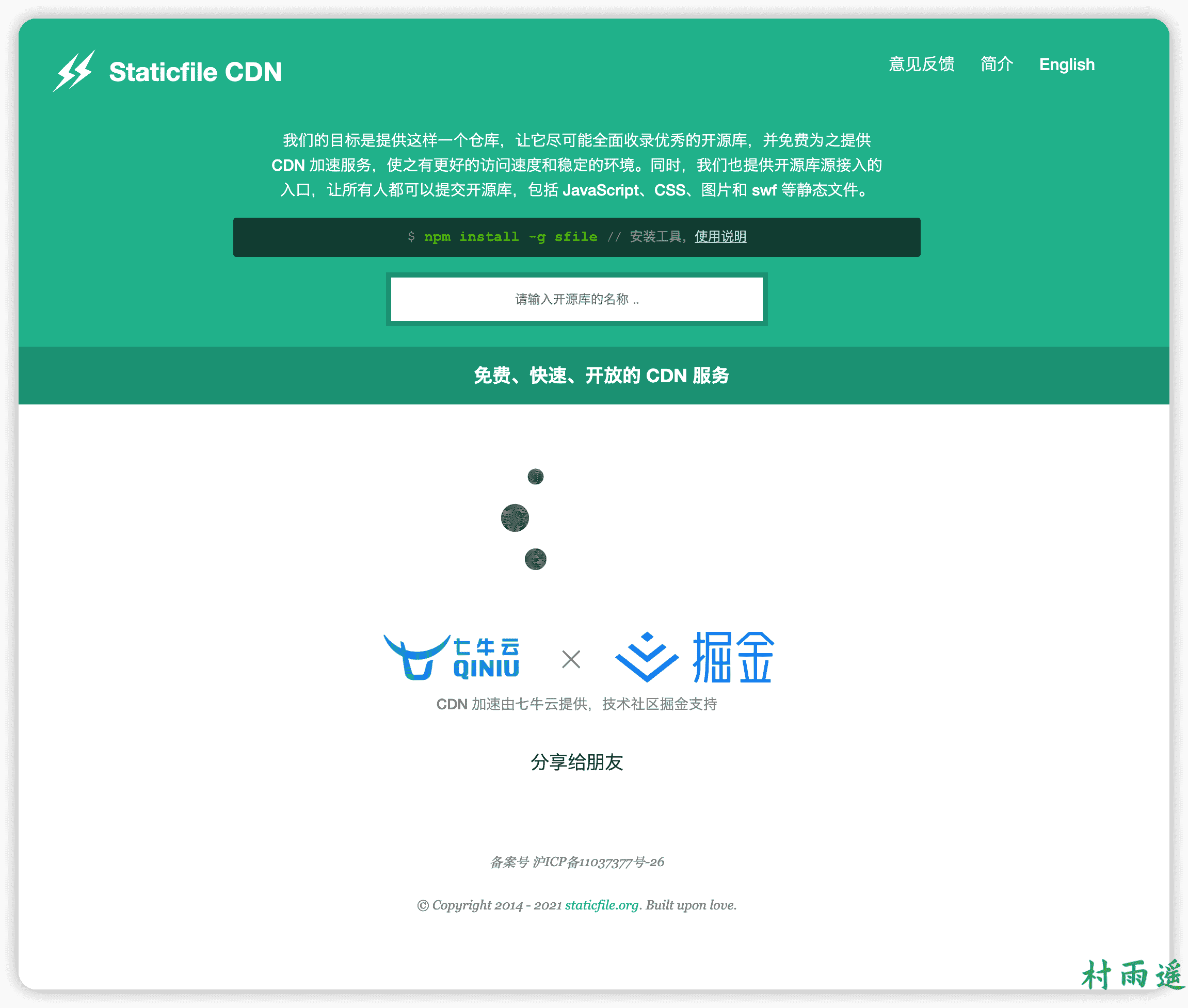 这是一个免费、快速、开放的 CDN 服务。你可能没听过这个 CDN,不过没关系,它背后的双引擎:七牛云和掘金想必你不会陌生吧。该网站由七牛云提供 CDN 加速,由技术社区掘金支持。