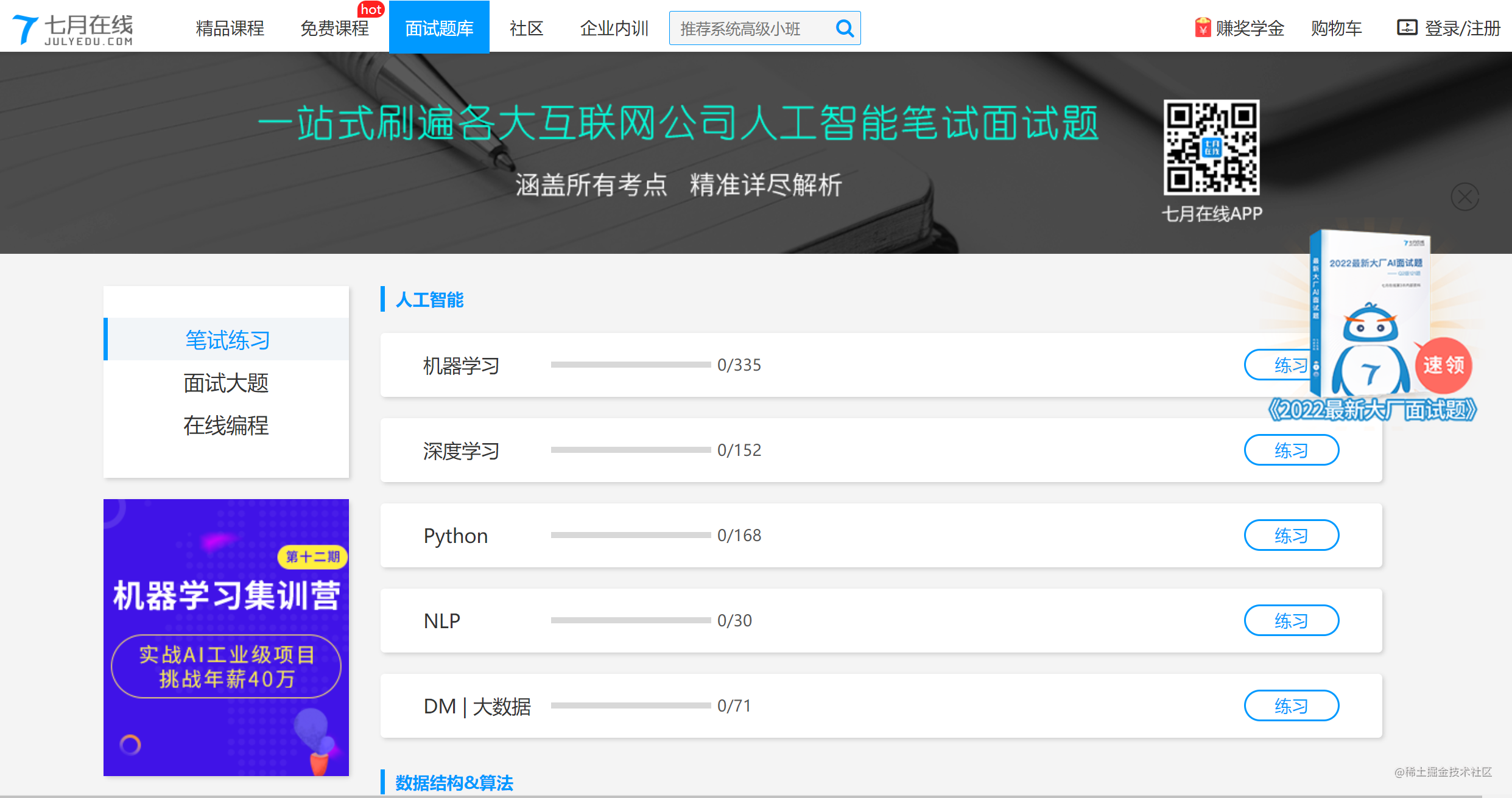 一站式刷遍目前国内各大互联网公司人工智能笔试面试题,涵盖了所有考点,解析精准详尽。 站中主要分为笔试练习、面试大题、在线编程三大模块,而各个模块下又分别设置了:人工智能、数据结构与算法、数理逻辑、编程开发、计算机基础等子模块,可以说是非常详细了。