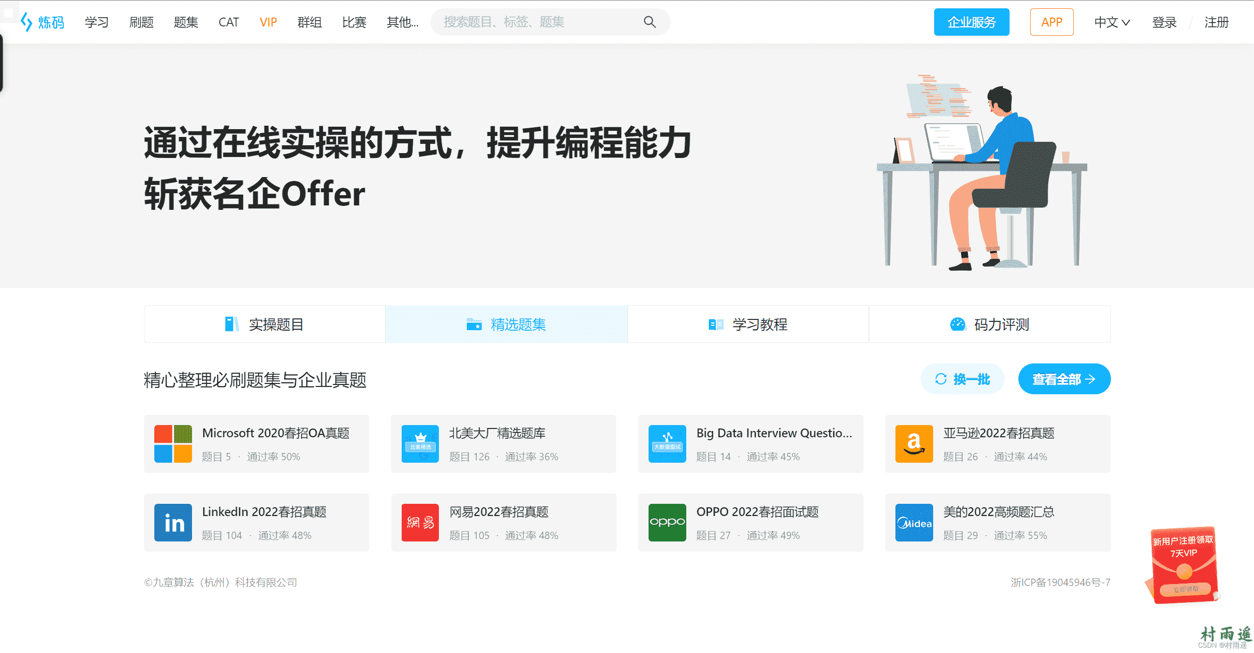 通过在线实操的方式,提升你的编程能力,从而轻松斩获名企 Offer。 这里不仅有实操题目,还有各种精选题目集,更有针对热门编程语言如 Python、Java、SQL 等的学习教程,更有码力评测栏目,快来试试你的码力处于什么段位吧!