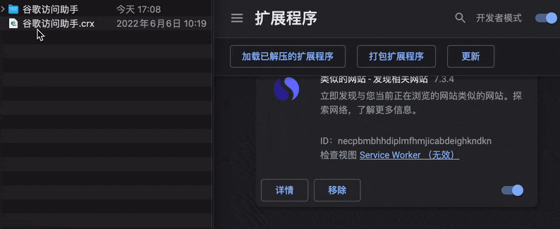 不过在那之前,需要先把浏览器扩展程序中的开发者模式打开。