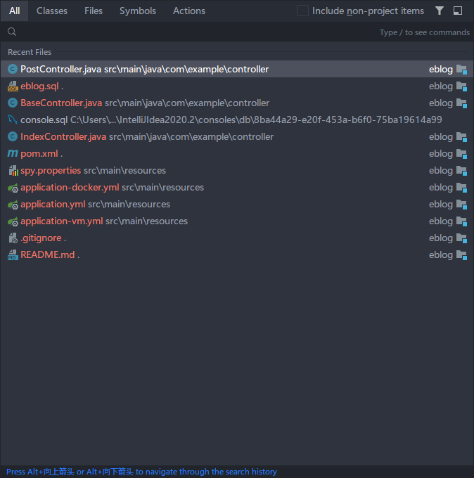 其实在 IDEA 的新版本中,文件查找、菜单或操作查找、万能查找都集成到了一起,所以我们只需要记住其中一种启动方式即可!