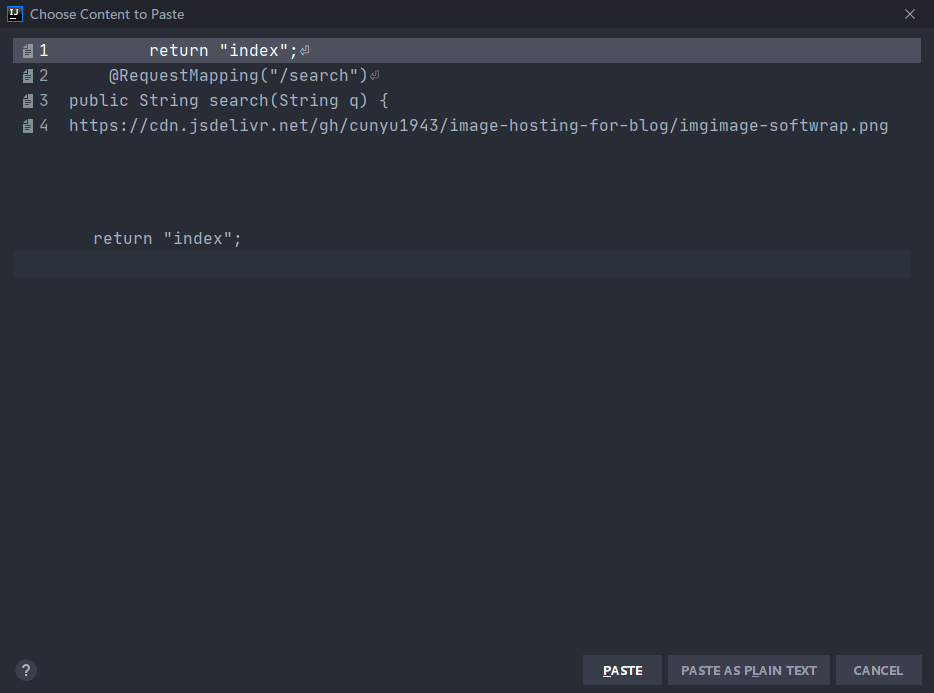 我们知道,最常用的复制粘贴是通过 Ctrl + C/V,但如果要针对复制历史进行粘贴,此时在 IDEA 中可以通过 Ctrl + Shift + V 来进行自主选择自己想要粘贴的内容;