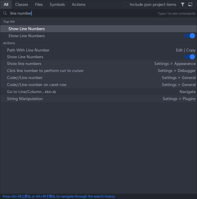 通过 Ctrl + Shift + A 快捷键,然后就能通过关键字来查找我们所需要的菜单和操作;