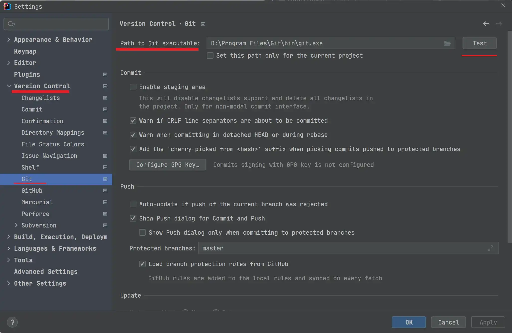 接下来就来说说,当我们安装好 Git 后的事。安装好 Git 之后,打开 IDEA 的设置界面,依次进入 File -> Settings -> Version Control -> Git(也可以通过快捷键 Ctrl + Alt + S 进入设置),然后将 Path to Git executable 设置为你安装的 Git 所在路径即可,比如我的是 D:\Program Files\Git\bin\git.exe。