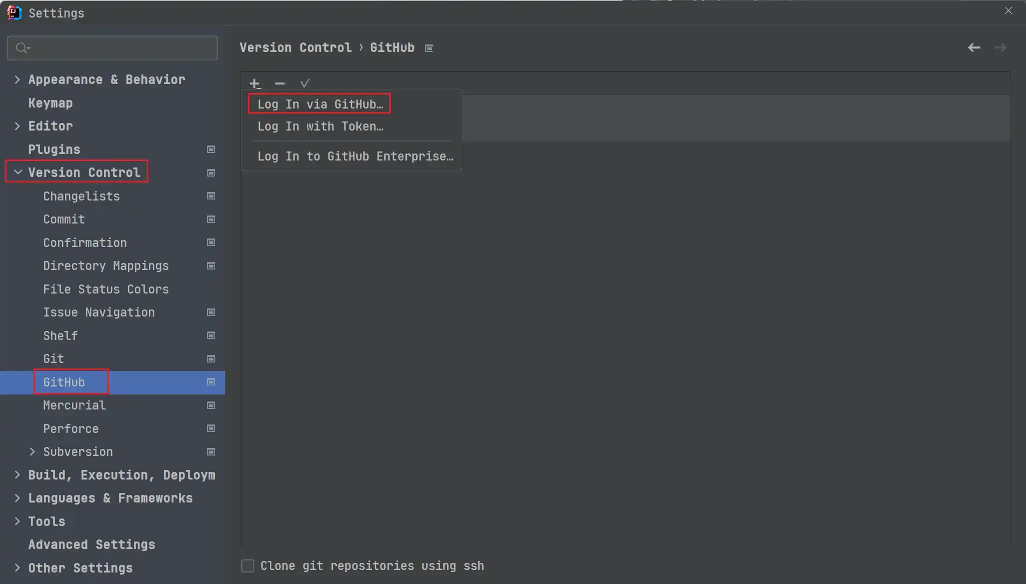 同样的,我们可以发现 Version Control 中还有一个 Github 选项卡,这里我们可以使用自己的 Github 账号进行登录,即 Log In via Github,然后就可以直接将我们 Github 上的代码拉取下来了。